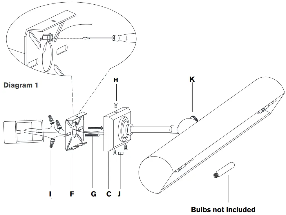 - Wrap fixture ground wire (bare copper) around the green grounding screw (see diagram 1). Tighten. Continue fixture ground wire and connect to supply ground wire (usually green or bare copper) using wire nut (I). NOTE: It is imperative that the fixture is grounded.