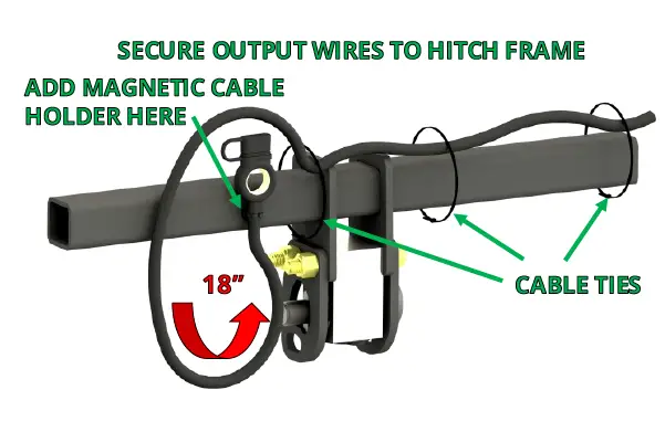 - Secure harness to Stealth hitch frame with cable ties. Maintain an 18” loop from the cable tie to the 4-way plug. Add the magnetic cable holder and secure to the harness close to the 4-way plug, with a cable tie.