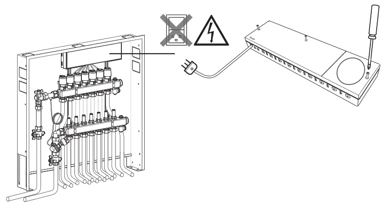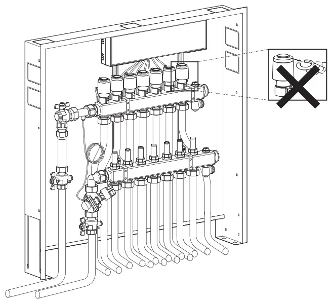If no mains power for the heat up period (screed drying) do not remove the red mounting split! Heat up the installation with TWA open, do not remove the retaining ring on the actuator! The plastic heat meter insert is not for permanent operation! Please exchange in case no heat meter is mounted!