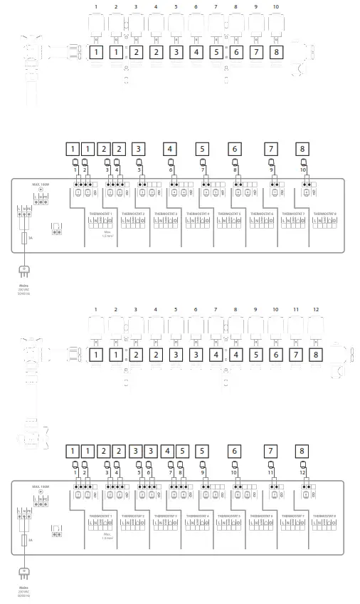 It is possible to connect up to 8 room thermostats. Power off the Wiring Center when wiring the thermostats. Detailed information could be found in the controller installation guide.