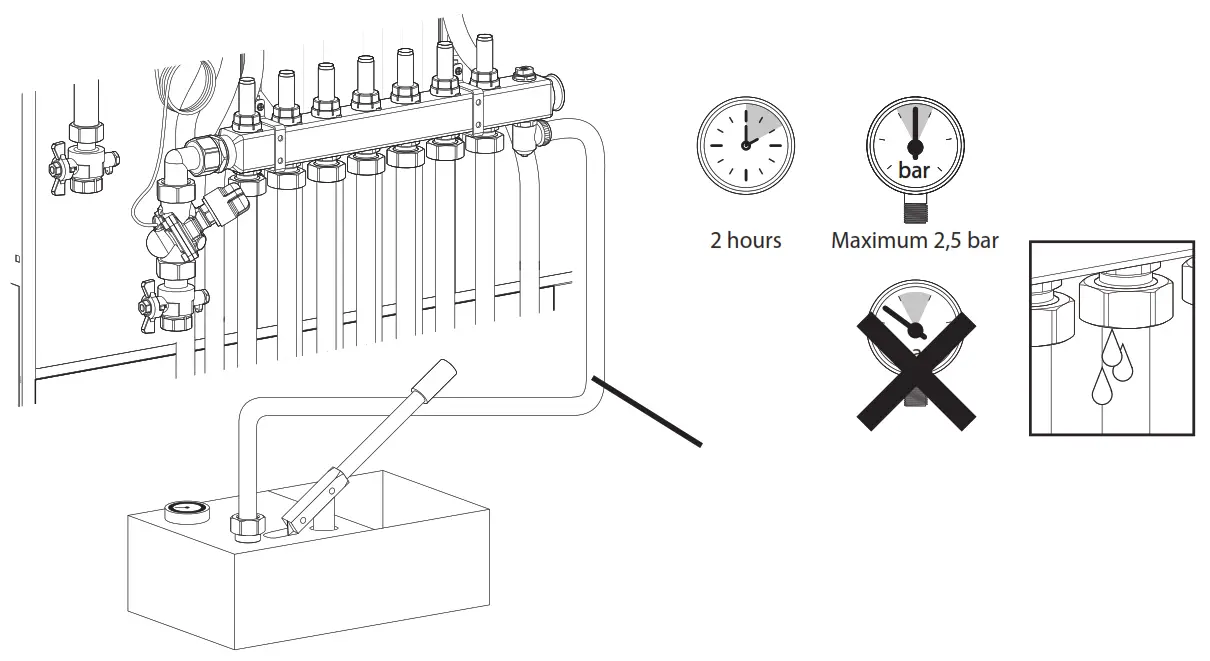 Follow national standard and safety instructions from EN 14336 Apply 0,5 bar air pressure for approx. 10 minutes and check for leakage. Possible leakages can be found with leakage spray or applying soap water.