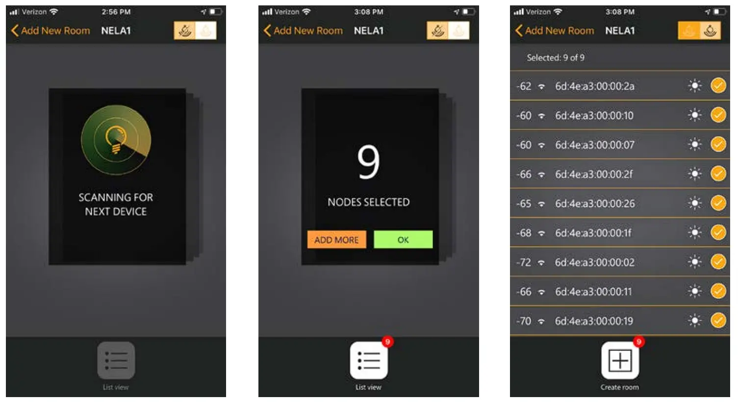 When all the requested nodes have been found or there are no remaining nodes, the user needs to press the “List view” button at the bottom of the screen, which will bring up the list view page with the selected nodes. There, additional nodes can be added or existing nodes can be removed. To finish the room creating the user needs to press the “create room” button at the bottom of the page.