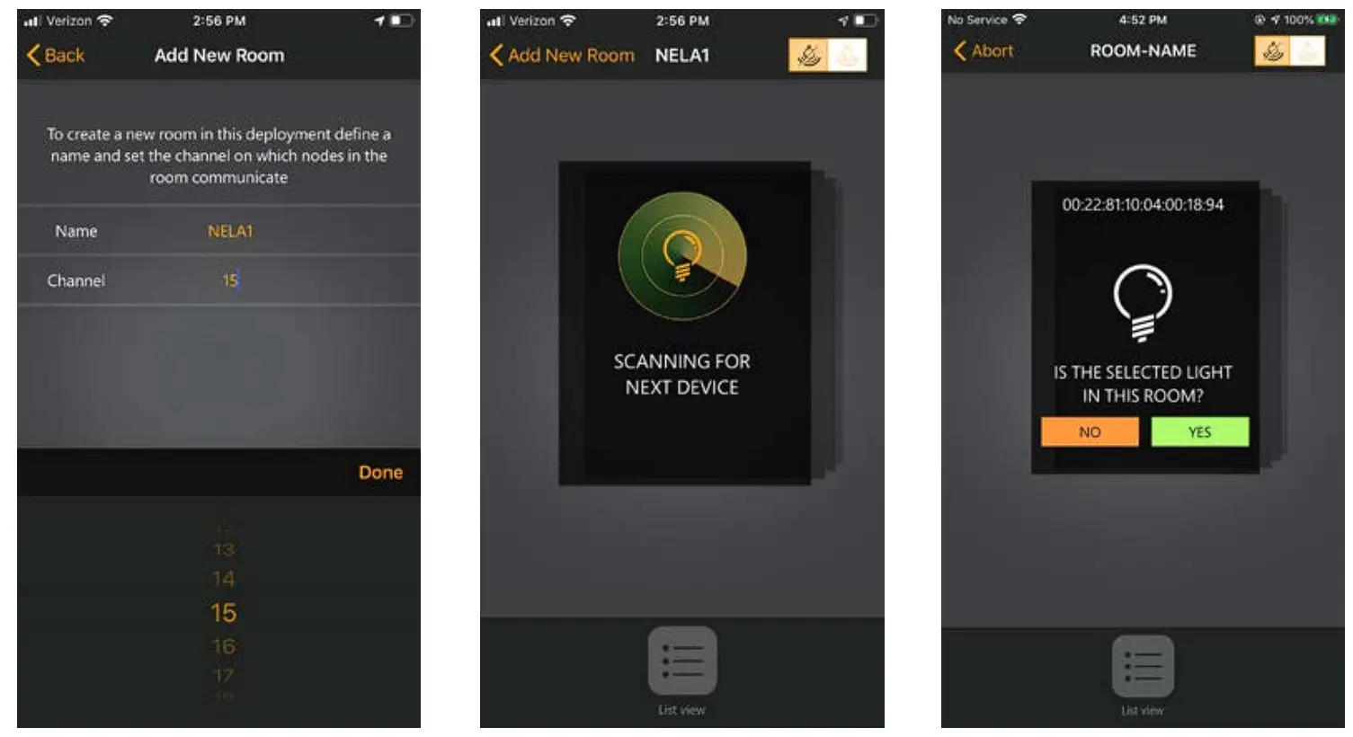 The “scanning for next device” message will appear and the application scans for available nodes. If a node is found the user can add that node to the room with the “YES” or ignore it with the “NO” button. (The node window can be swiped to left or right.) The maximum number of nodes (components) that can join a single room is 30, but the maximum number is in the thousands.