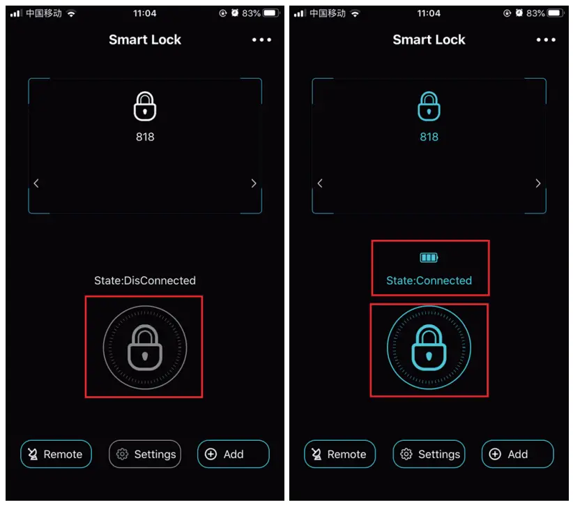 Step 3. Click the lock icon to connect the lock. After it is connected the battery status will appear. (When the lock is on low power charge it)