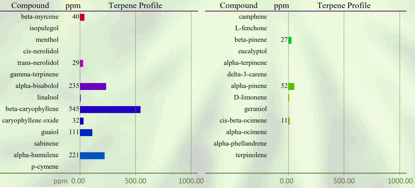 The client sample was analyzed by Head-Space Gas Chromatography (HS-GC). The collected data was compared to data collected for certified reference standards at known concentrations. All values are semiquantitative estimates based on recorded peak areas relative to terpene calibration data.