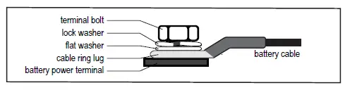 WARNING: HAZARD OF FIRE AND EQUIPMENT DAMAGE- Do not place washers in between the battery’s power terminal and the battery cable’s ring lug. Doing so may cause excessive heating due to high resistance.