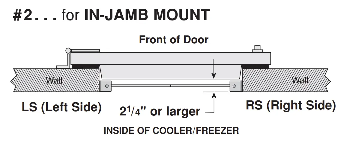 The thickness of your door jamb will determine which mounting method to use. While standing inside the cooler or freezer, measure from the back of the closed door to the inside wall surface. (See drawings below.)
