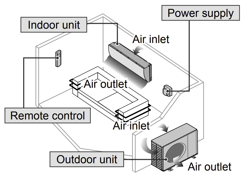 | Do not open window or door for long time during operation, it may lead to inefficient power usage and uncomfortable temperature changes. |