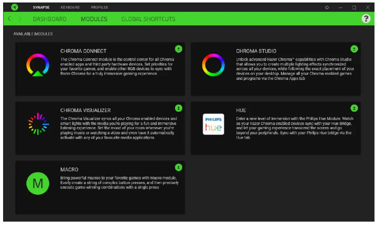 The Dashboard subtab is an overview of your Razer Synapse where you can access all your Razer devices, modules, and online services.