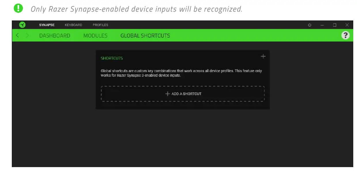 Bind operations or Razer Synapse functions to custom key-combinations from any Razer Synapseenabled device inputs which apply across all device profiles.