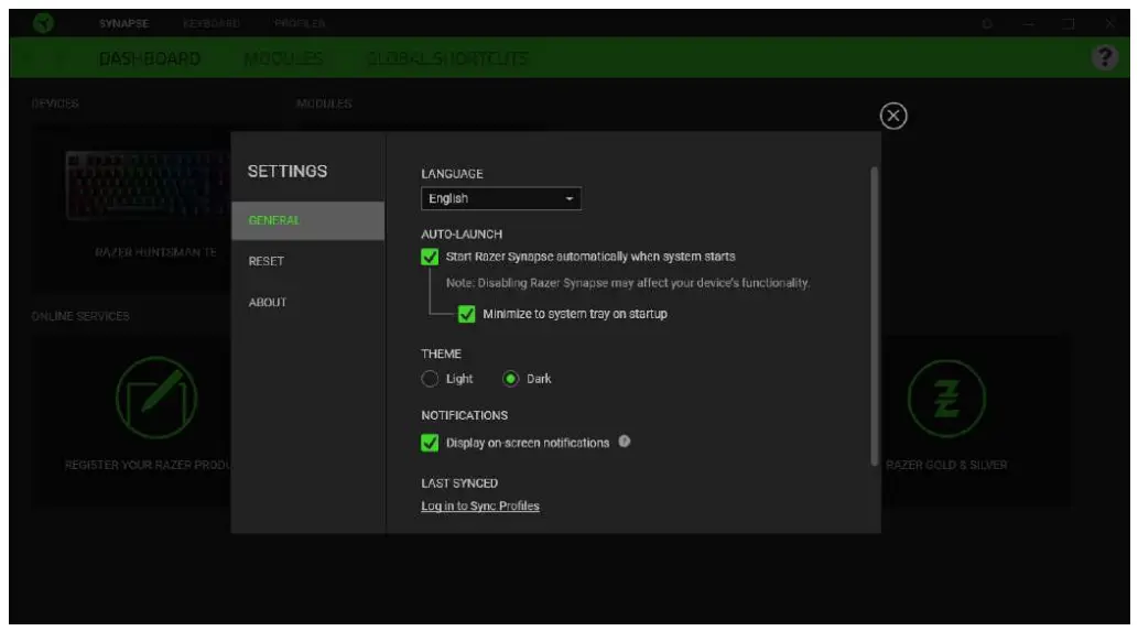 The default tab of the Settings window. The General tab enables you to change the software’s display language, start-up behavior, and display theme. You may also manually sync your profiles to the cloud { C } or view the master guide of all connected Razer devices and installed modules.