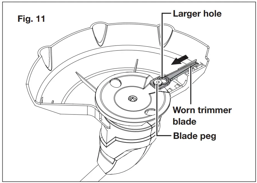 - To remove the worn blade, first move the blade inward as shown until the blade peg is in the larger hole of the blade.