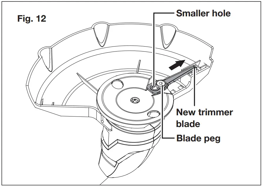 - Fit the blade peg in to the larger hole of the new blade, and pull the new blade outward until the peg is locked in the smaller hole of the new blade (Fig. 12).