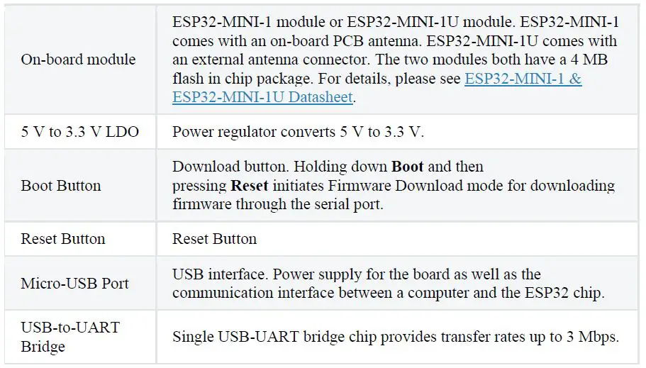The following figure and the table below describe the key components, interfaces and controls of the ESP32-DevKitM-1 board. We take the board with a ESP32-MINI-1 module as an example in the following sections.