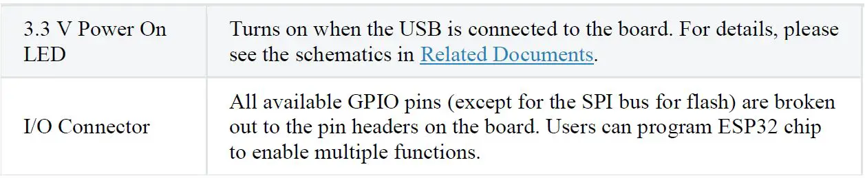 The table below provides the Name and Function of pins on both sides of the board. For peripheral pin configurations, please refer to ESP32 Datasheet.
