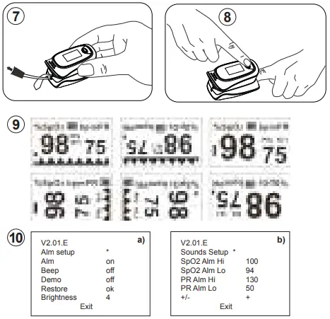 On settings menu (interface 2) AT-b, press the ON/OFF button 1 to switch between options. On this interface, you can set the upper limit and lower limit of SpO2 Alm and PR Alm. While the «*» symbol stays on the +/- option, hold the functional button to set the option to + or -. In + mode, select the corresponding option and hold the ON/OFF button to increase the upper or lower limit; in – mode, hold the ON/OFF button to decrease the upper or lower limit. Move «*» to the Exit option, and hold the ON/ OFF button to return to the monitoring interface.