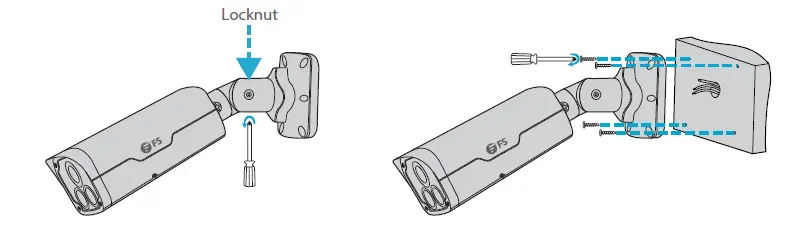 - Screw the locknut to loosen the universal joint, then secure the camera to the wall by leading the self-tapping screws through the guide holes in the base and fix them to the wall by using a screwdriver.