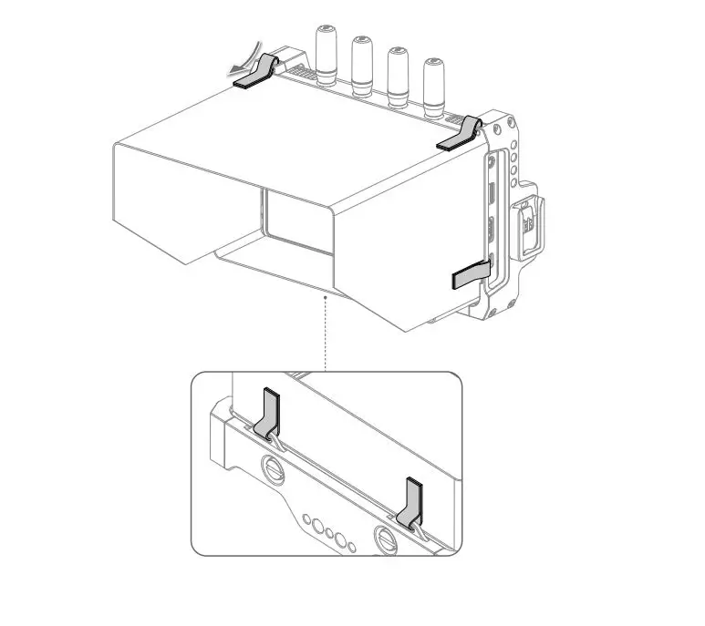 Unfold the remote monitor hood, pass the Velcro on the hood through the mounting holes on the remote monitor cage as shown, and attach the Velcro firmly.