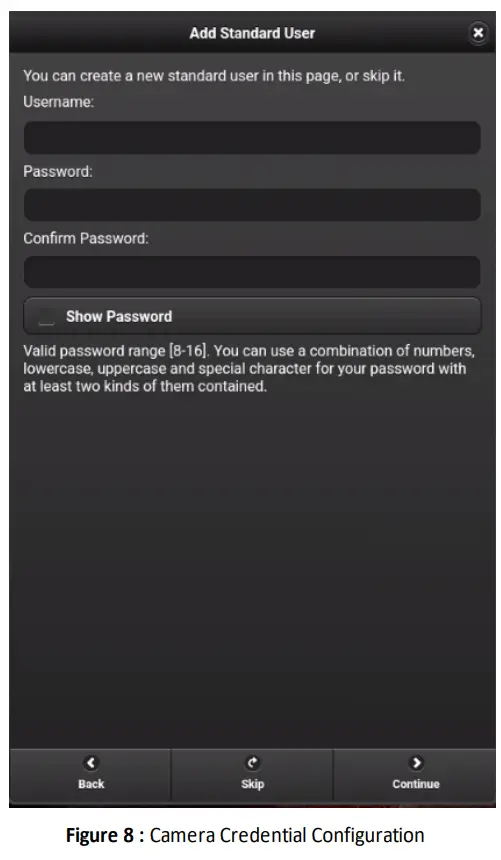 - After standard user creation (or skipping standard user) , the user will be asked to select the camera’s network connection type. Select Wired Connection and tap Continue to proceed. A live feed from the camera will now deploy(Figure 2-9)