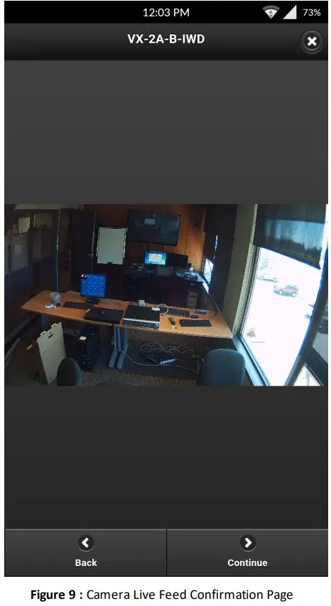 Warning: It is extremely important to obtain the desired camera field-of-vision during this step. Physically reposition the camera as needed to obtain the desired field-of-vision before continuing on with the setup process. - When you have confirmed that you are receiving video from the correct camera, position the device to obtain the desired field-of-vision. Tap Continue. For standard VISIX Gen III Cameras, proceed through the remaining steps of this section. For VISIX Thermal Camera users, complete VCA rule as detailed in “VCA Rule Creation – Thermal-models Only” before finishing the remaining steps in this section.
