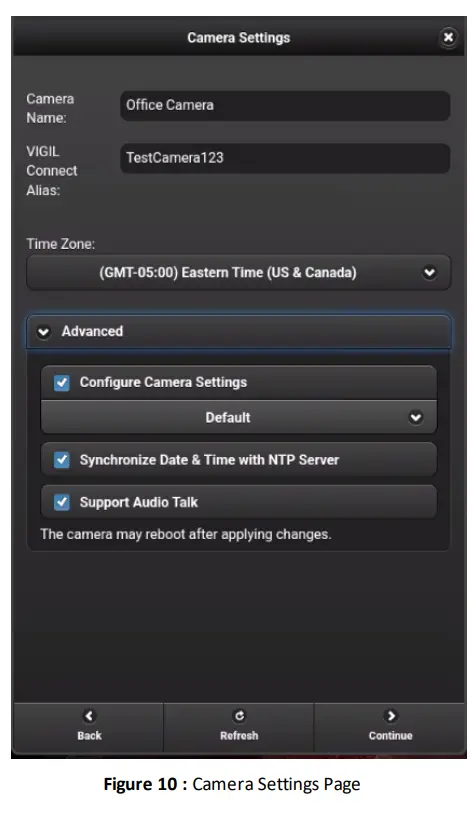 - The Camera Settings page will now be visible. Configure available settings. By default, the settings profile “Default” (under the Advanced section) will be selected. After camera setup is complete, navigate to your camera’s web UI to change settings from their defaultstate if desired.