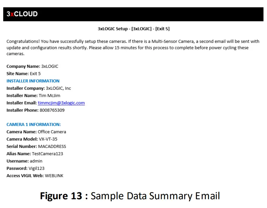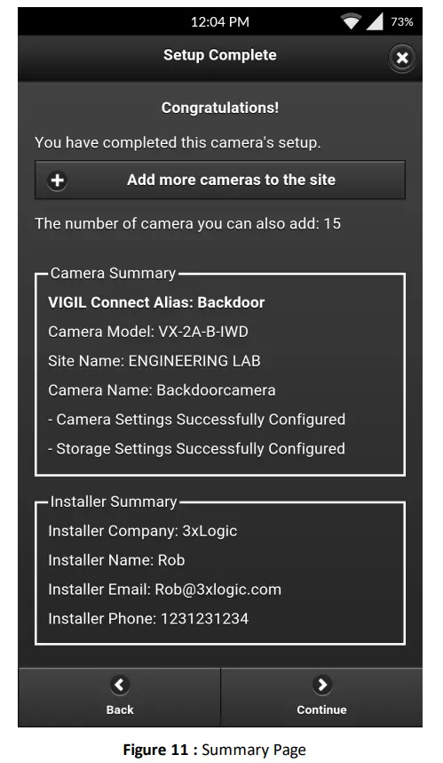- After filling in settings, click continue to proceed. You will be prompted thatsetup is complete and will be presented with the Camera and Installer Summary data (Figure 2-11)