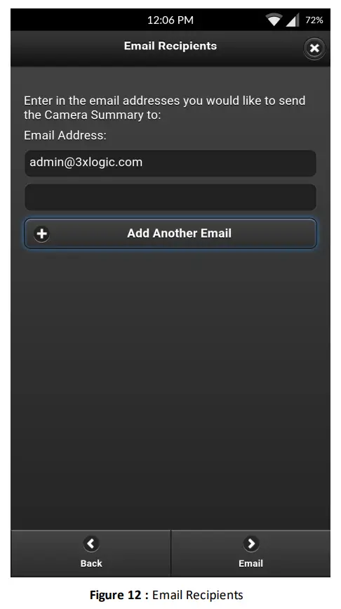- Add a recipient by entering the desired email address into the text field. Click Add Another Email and enter in another email address and repeat as desired for multiple recipients. Tap the Email button to send emails to the listed recipients. If no recipients are desired, tap the Skip button(button is only visible when no recipients have been added to the list).