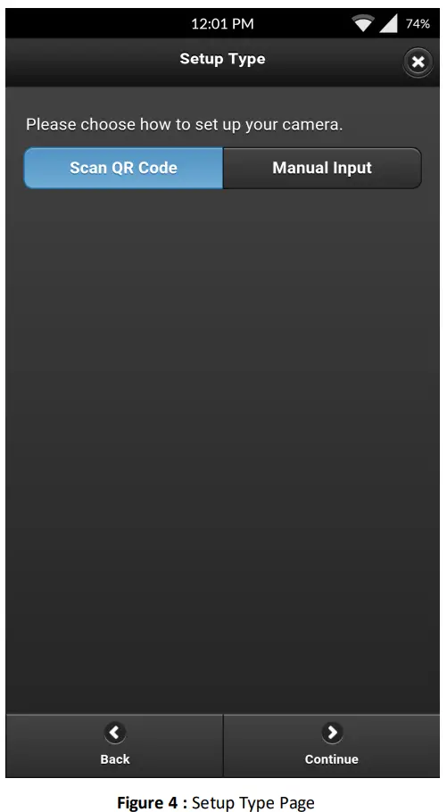 - Select your preferred Setup Type.Scan QR Code(Automatic) or Manual Input. The Scan QR Code feature will automatically retrieve the required serial number from the device’s QR code. Select Manual Input if you would like to manually enter the device’s serial number. Serial numbers and QR codes will be printed on a label affixed to the device itself.