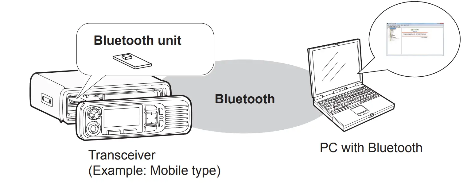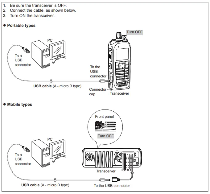 To setup from a PC using a USB cable (A – micro B type), follow the steps below.Step 1 Install the USB driver.Step 2 Connect the transceiver and PC using the cable.Step 3 Setup. (p. 6)