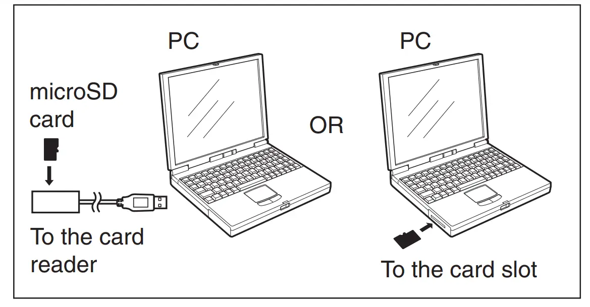 , or select “Save Ctrl+S” or “Save As…” in the <File> menu to save the entered data in a data file (ICF file). - Insert the microSD card into the card drive or a memory card reader* on your PC, as shown below. *User supplied.
