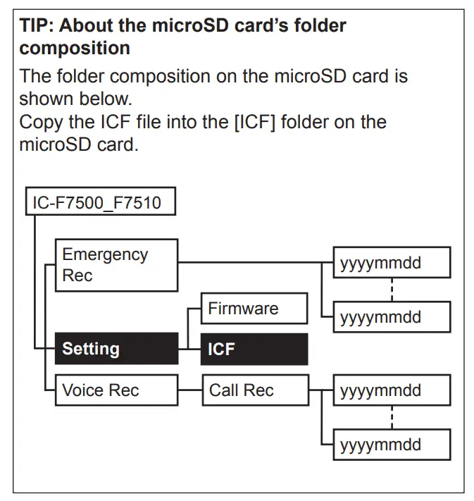 - Copy the ICF file into the [ICF] folder on the microSD card.
