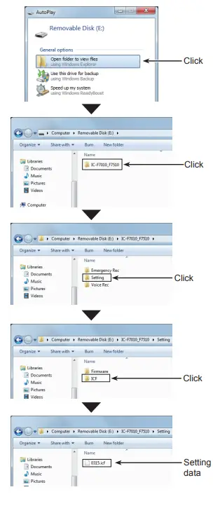 Copying the ICF file in the PC into the [ICF] folder on the microSD card.