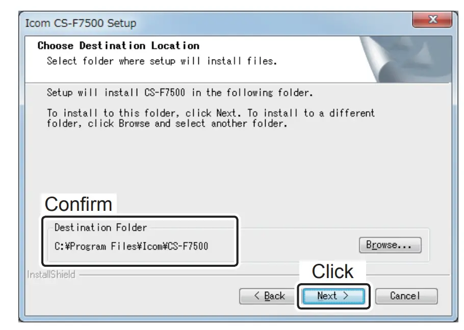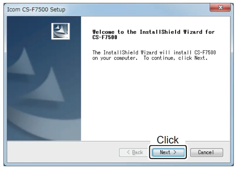 If “User Account Control” is displayed, click <Yes> to continue. - “Welcome to the InstallShield Wizard for CS-F7500” is displayed. Click <Next>>.