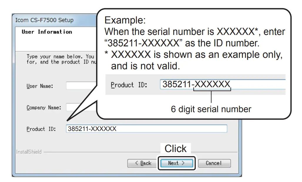 Enter your name, your company name (option), and the product ID number, as described below. Click <Next >>.