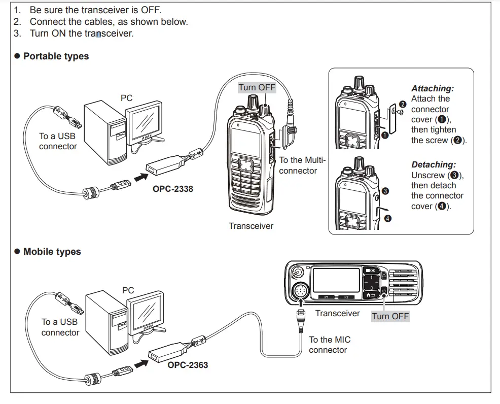 To setup from a PC using an optional OPC-2338 or OPC-2363 cable, follow the steps below.Step 1 Install the USB driver.Step 2 Connect the transceiver and PC using the cable.Step 3 Setup. (p. 4)
