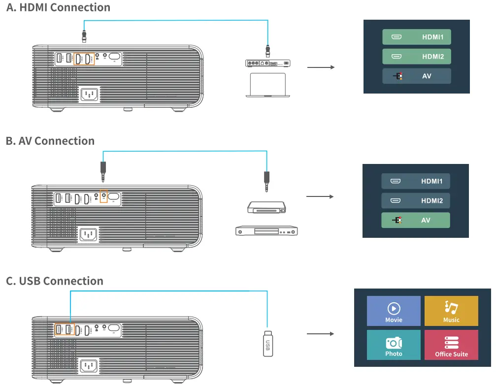 - Connect your device to the projector correctly.