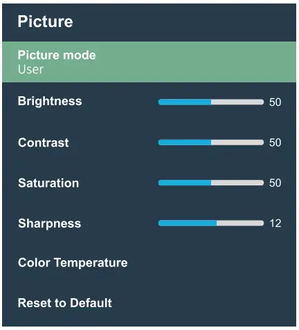 | Reset to Default | Press to restore original picture setting. | |