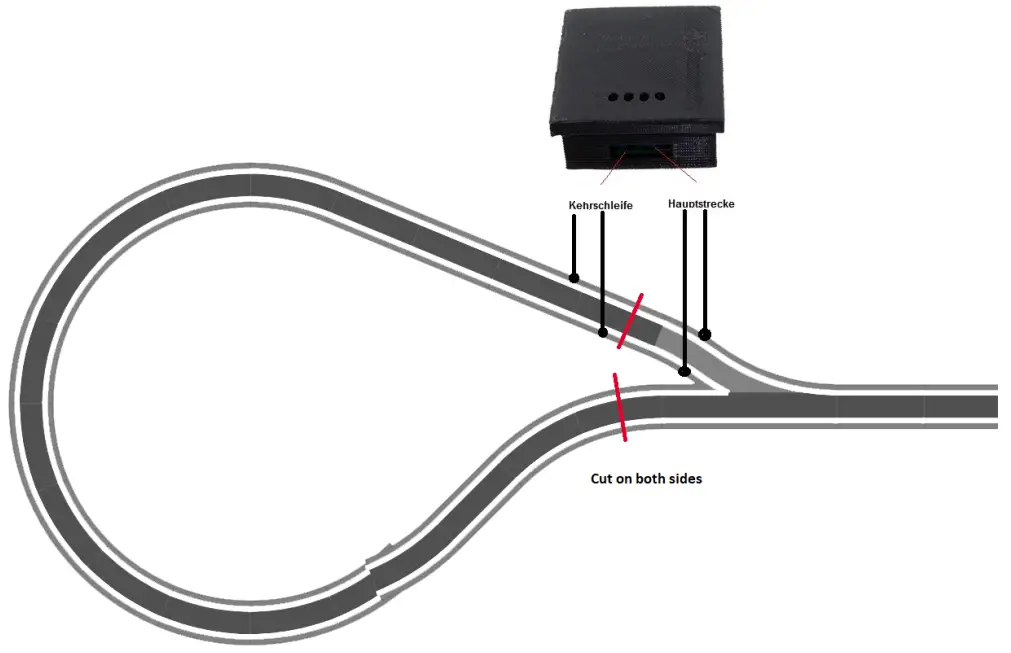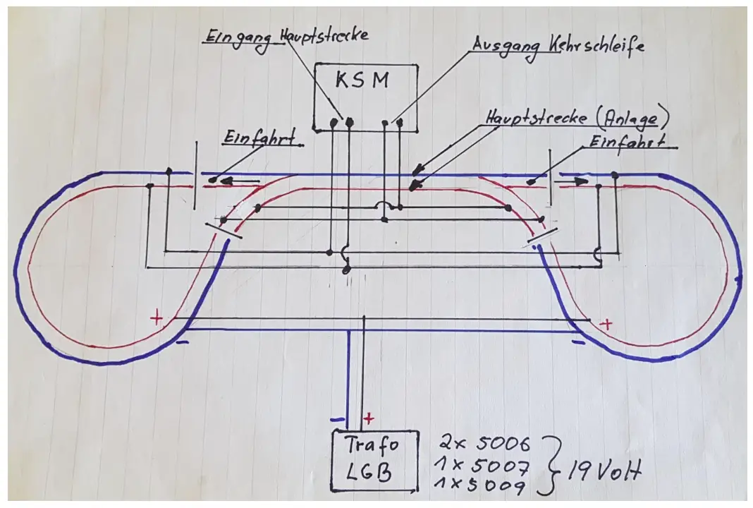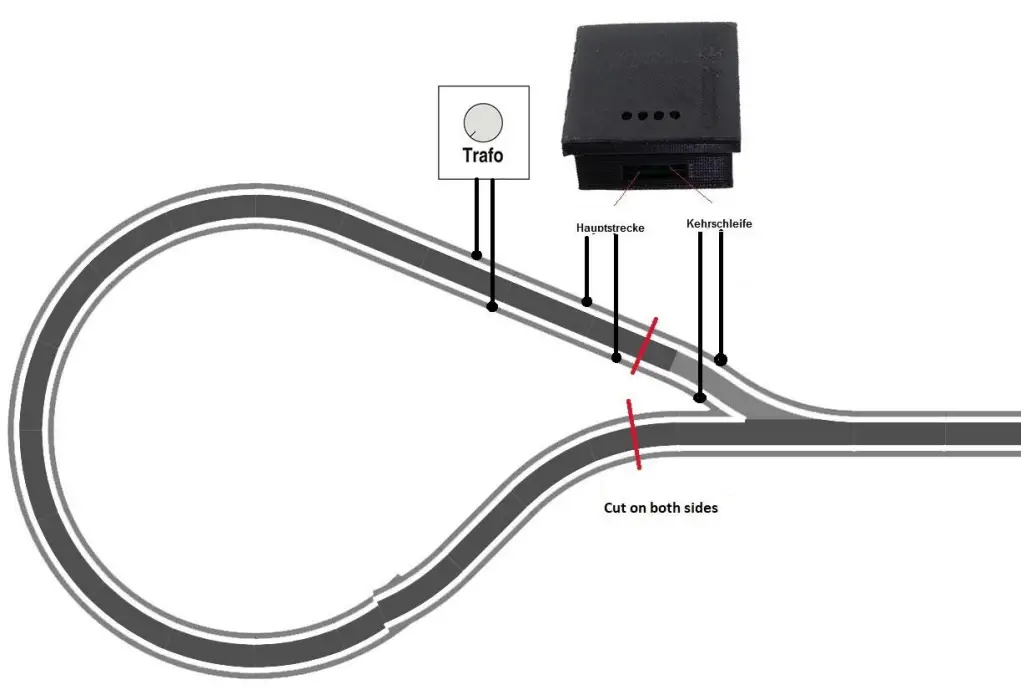 In digital mode, you can use the KSM just connect as usual and so that the separation point, so the reverse loop supply. There is no need to pay attention. The ,,Hauptstrecke” is powered by the central station or booster. Same for triangles or turntables. By turntables, all output tracks, should be connected to main track.