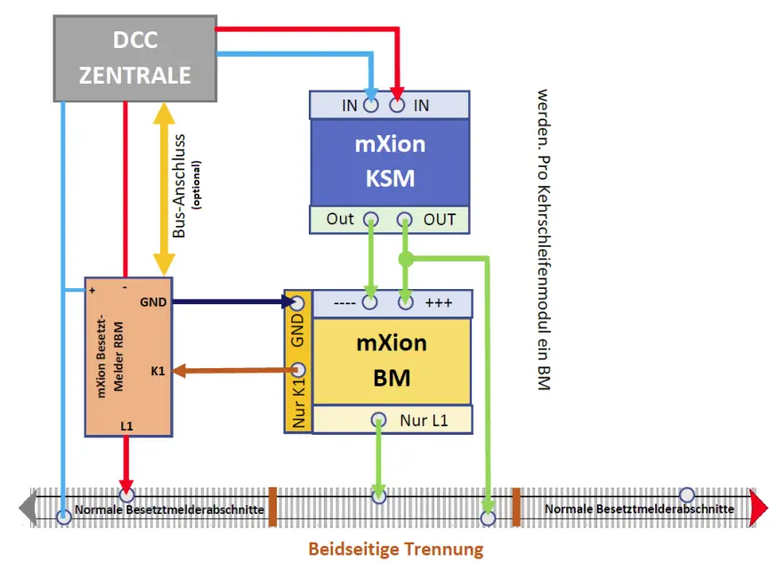 Around the reverse loop module or the track triangle in the being able to display the occupancy message correctly is one thing special wiring is necessary because the KSM has a own consumption. Here in the example ist he use of our central 30Z with connection via LocoNet and with our occupancy detectors as well as feedback modules (BM & RBM) are shown. The trick behind the circuit ist hat the KSM is switched in front of the occupancy reporting module. Of course, the occupancy reporting module then polest he BM, therefore 1 BM module per loop ,,get wasted”.