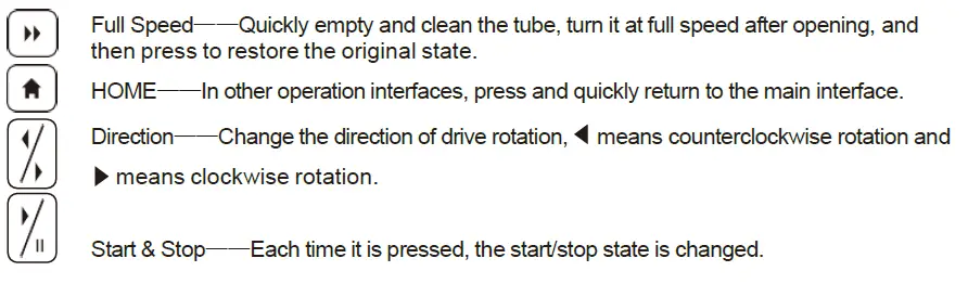 Foot switch and Hand held dispensing controlle are options. These devices only control the start and stop status of the pump, and the running speed and direction are set through the operation panel. The foot switch is connected to the DB-15 external control interface of the peristaltic pump. Under external control, the start-stop key and the full-speed key are invalid. The HOME key, arrow keys, and touchscreen settings are used normally.