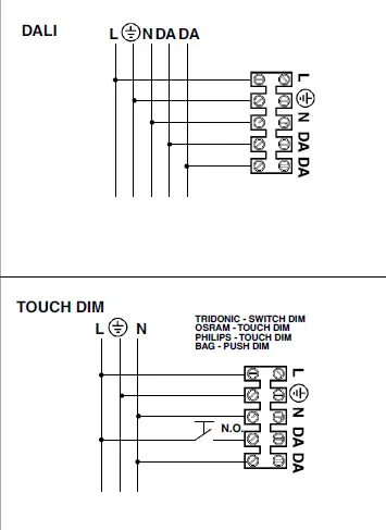 Devices with digital control gear may be dimmed using DALI devices or a normally-open button (N.O.) to be connected as shown in the diagram.![]()