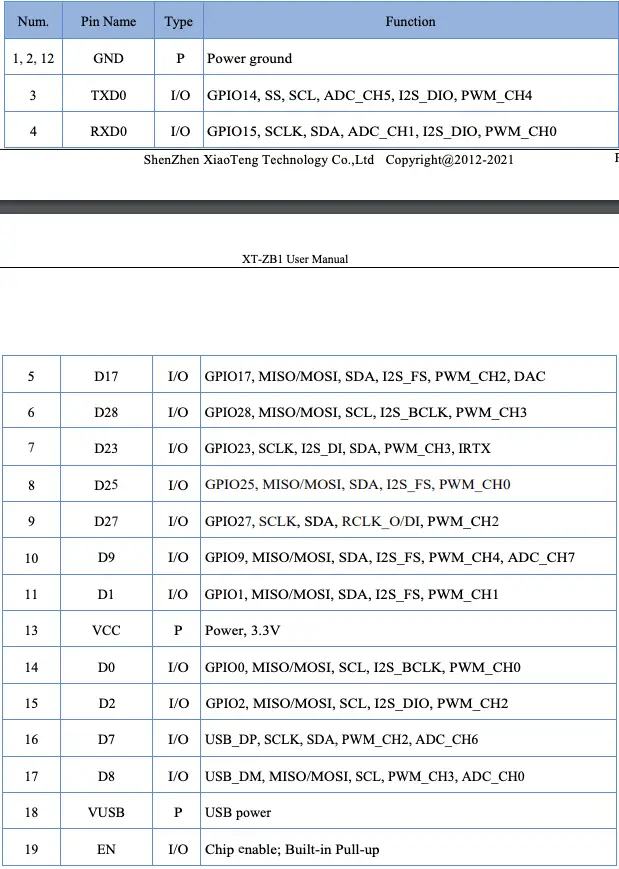 XT-ZB1 module interface definition is shown as below