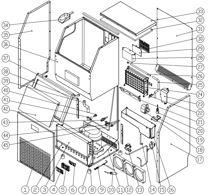 All the components & surfaces exposed to water or ice cubes, like ice storage bin, water tank, door, evaporator, water pump, silicone tube, water dividing pipe, etc. should be cleaned by Using Nu-Calgon Nickle Safe Ice-machine Cleaner per each 6 months. They should be cleaned by the serviceman according to ice making assembly system cleaning program.
