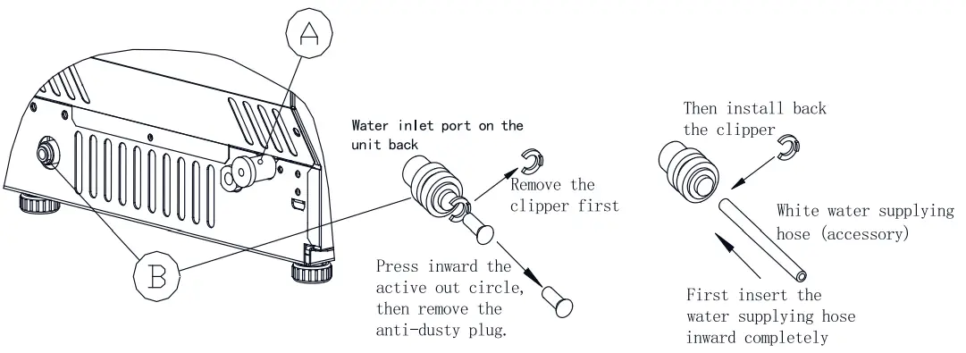 - Water draining port: Normal plugged with the cap. When need to drain the water, unplug the cap.