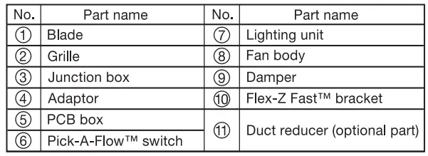 These products use a sirocco fan driven by a DC motor powered by an integral transformer. The motor is designed to have long operating life, high dynamic response, higher speed ranges and energy savings. The grille covering the fan body is a spring-attached, quick removal type. A damper for preventing air counter flow is provided. The blower uses a high-capacity sirocco fan developed to reduce the noise level. The lighting unit is an energy-saving LED lighting device that uses one 10 W LED lamp and produces almost the same illumination as a standard 40 W incandescent lamp. Night light feature consumes around 0.1 to 0.4 W.