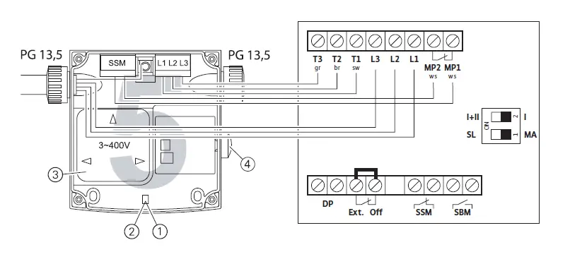| EM | For mains connection: EM = 1~230 V, 50 Hz (single-phase motor) DM = 3~400 V, 50 Hz (three-phase current motor) |