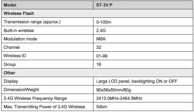 - With ST-IV P wireless flash trigger, high speed synchronization is available for most of camera flashes in the market which support TTL. The max flash synchronization speed is up to 1/8000s 1/8000s is achievable when the camera has a max camera shutter speed of 1/8000s.