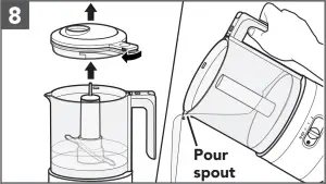 - Once processing is complete, remove the Lid, Drive adapter, and Multipurpose blade to use the Pour spout.