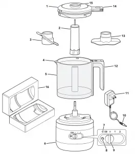 Bowl, Lid, Whisking accessory, Drive adapter, and Multipurpose blade.