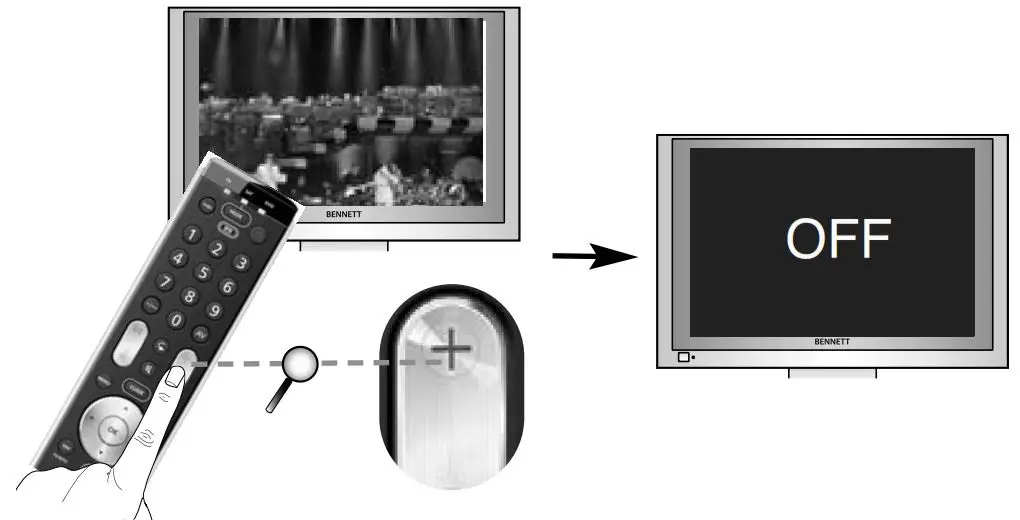 - Press and hold the “number key” according to your brand (e.g. for Bush tv = press 1) until your device switches off. The blue LED will switch off every 3 seconds as a ‘power